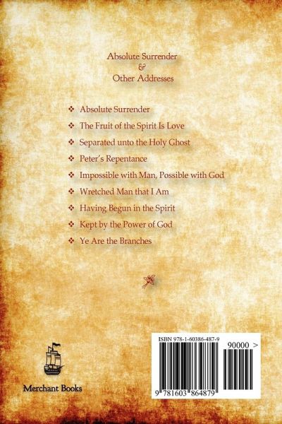 An Unabridged Edition of Absolute Surrender and Other Addresses; Sermons Include: Absolute Surrender - The Fruit Of The Spirit Is Love - Separated Unto The Holy Ghost - Peter's Repentance - Impossible With Man, Possible With God - Wretched Man That I Am - Having Begun In The Spirit - Kept By The Power Of God - Ye Are The Branches