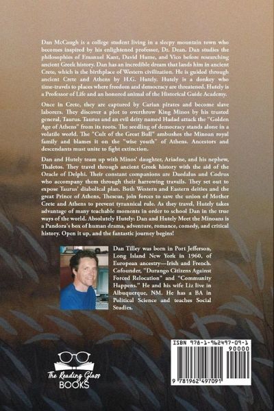 Synopsis: Dan McCaugh is a college student living in a sleepy mountain town who becomes inspired by his enlightened professor, Dr. Dean. Dan studies the philosophies of Emanuel Kant, David Hume, and Vico before researching ancient Greek history. Dan has an incredible dream that lands him in ancient Crete, which is the birthplace of Western civilization. He is guided through ancient Crete and Athens by H.G. Hutely. Hutely is a donkey who time-travels to places where freedom and democracy are threatened. Hutely is a Professor of Life and an honored animal of the Historical Guide Academy.Once in Crete, they are captured by Carian pirates and become slave laborers. They discover a plot to overthrow King Minos by his trusted general, Taurus. Taurus and an evil deity named Hadad attack the "Golden Age of Athens" from its roots. The seedling of democracy stands alone in a volatile world. The "Cult of the Great Bull" ambushes the Minoan royal family and blames it on the "wise youth" of Athens. Ancestors and descendants must unite to fight extinction. Dan and Hutely team up with Minos' daughter, Ariadne, and his nephew, Thaletos. They travel through ancient Greek history with the aid of the Oracle of Delphi. Their constant companions are Daedalus and Codrus who accompany them through their harrowing travails. They set out to expose Taurus' diabolical plan. Both Western and Eastern deities and the great Prince of Athens, Theseus, join forces to save the union of Mother Crete and Athens to prevent tyrannical rule. As they travel, Hutely takes advantage of many teachable moments in order to school Dan in the true ways of the world. Absolutely Hutely: Dan and Hutely Meet the Minoans is a Pandora's box of human drama, adventure, romance, comedy, and critical history. Open it up, and the fantastic journey begins!Autobiography: Dan Tilley was born in Port Jefferson, Long Island New York in 1960, of European ancestry-Irish and French. Cofounder, "Durango Citizens Against Forced Relocation" and "Community Happens." He and his wife Liz live in Albuquerque, NM. He has a BA in Political Science and teaches Social Studies.