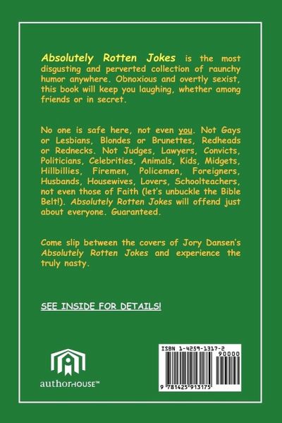 Sick Humor is often ruined by those erring on the side of caution. Not here. Absolutely Rotten Jokes is the most disgusting and perverted collection of raunchy humor anywhere. Thoroughly obnoxious and overtly sexist, this book will keep you laughing, whether among friends or in secret. No one is safe here, not even you. Not Gays or Lesbians, Blondes or Brunettes, Redheads or Rednecks. Not Judges, Lawyers, Convicts, Politicians, Celebrities, Animals, Kids, Midgets, Hillbillies, Firemen, Policemen, Foreigners, Husbands, Housewives, Lovers, Schoolteachers, not even those of Faith (let's unbuckle the Bible Belt!). Absolutely Rotten Jokes will offend just about everyone. Guaranteed. So, come slip between the covers of Jory Dansen's Absolutely Rotten Jokes and experience the truly nasty. See inside for details.