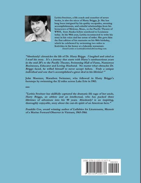 Absolutely chronicles the quirky life of Dr. Harry Briggs, WWII Marine, the first person to swim the 32 miles across Lake Erie, persistent entrepreneur, and, at 90 years old, still a political science professor. About this amazingly candid tale, John Muenzer, Marathon Swimmer, says: "I laughed and cried as I read his story. Harry's journey starts with his rambunctious years in his mid 20's to the Pacific Theater, Swimming Hall of Fame, numerous businesses, educator and loving husband. No matter what obstacles Dr. Briggs faced, he willed himself to never accept failure. Truly a unique individual and one that's accomplished a great deal in his lifetime!" Frank Cox, Marine veteran and award-winning author says, "Letitia Sweitzer has skillfully captured the dramatic life saga of her uncle, Harry Briggs, an athlete and an intellectual, who has packed three lifetimes of adventure into his 90 years. Absolutely! is an inspiring, thoroughly enjoyable, story about the can-do spirit of an American hero."