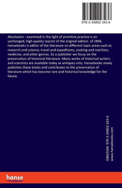 Absolution - examined in the light of primitive practice is an unchanged, high-quality reprint of the original edition of 1894.Hansebooks is editor of the literature on different topic areas such as research and science, travel and expeditions, cooking and nutrition, medicine, and other genres. As a publisher we focus on the preservation of historical literature. Many works of historical writers and scientists are available today as antiques only. Hansebooks newly publishes these books and contributes to the preservation of literature which has become rare and historical knowledge for the future.