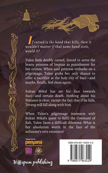 If cursed is the hand that kills, then it wouldn't matter if that same hand stole, would it? Tulen feels doubly cursed, forced to serve the bratty princess of Impian as punishment for her crimes. When said princess embarks on a pilgrimage, Tulen grabs her only chance to offer a sacrifice at the holy city of Suci-and maybe, finally, feel clean again. Sultan Mikal has set his face towards Suci-and certain death. Nothing about his Penance is clear, except the fact that if he fails, Terang will fall along with him. When Tulen's pilgrimage intersects with Sultan Mikal's quest to fulfil the Covenant of Salt, Tulen faces a difficult dilemma: What is her absolution worth in the face of the sultanate's very existence?