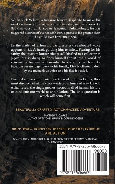 Is the greatest secret in all of human history worth dying for? When Rick Wilson, a treasure hunter desperate to make his mark on the world, discovers an ancient dagger in a cave on the Scottish coast, all is not as it seems. Unknowingly, he has triggered a series of events with consequences far greater than he could ever have imagined. In the midst of a horrific car crash, a disembodied voice appears in Rick's head, guiding him to safety. Fearing for his sanity, the treasure hunter tries to sell his find to a collector in Japan, but in doing so finds himself thrust into a world of criminality, betrayal and murder. Now staring death in the face, desperate to get back to his family, Rick is offered a deal by the mysterious voice and his fate is sealed. Pursued across continents by a team of ruthless killers, Rick must discover what the voice wants from him and why. He will either reveal the single greatest secret in all of human history or condemn our world to annihilation. The only question is which will come first?