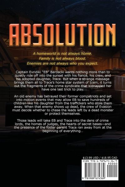 A homeworld is not always home. Family is not always blood. Enemies are not always who you expect. Captain Evridiki "EB" Bardacki wants nothing more than to quietly ride off into the sunset with his fiancé, his crew, and his adopted daughter, Trace. But when a strange message brings them all to Trace's home star system of Icem, it turns out the fragments of the crime syndicate that kidnapped her have one last trick to play. An old enemy has betrayed their former compatriots and set into motion events that may allow EB to save hundreds of children like his daughter from the traffickers who stole them away. When that enemy shows up dead, the crew of Evasion must decide whether to chase the leads left by a dead monster or protect themselves. Those leads will take EB and Trace into the dens of crime lords, the homes of judges, the hearts of secret bases-and the presence of the foster parent Trace ran away from at the beginning of everything...
