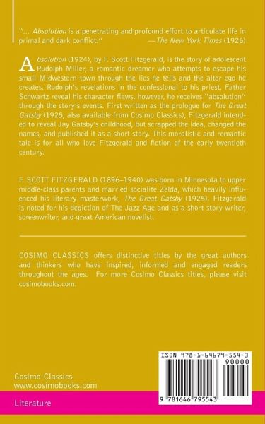 "... Absolution is a penetrating and profound effort to articulate life in primal and dark conflict." -The New York Times (1926) Absolution (1924) by F. Scott Fitzgerald is the story of adolescent Rudolph Miller, a romantic dreamer who attempts to escape his small, Midwestern town through the lies he tells and the alter ego he creates. Rudolph's revelations in the confessional to his priest, Father Schwartz reveal his character flaws, however, he receives "absolution" through the story's events. First written as the prologue for The Great Gatsby (1925, also available from Cosimo Classics), Fitzgerald intended to reveal Jay Gatsby's childhood, but scrapped the idea, changed the names, and published it as a short story. This moralistic and romantic tale is for all who love Fitzgerald and fiction of the early twentieth century.