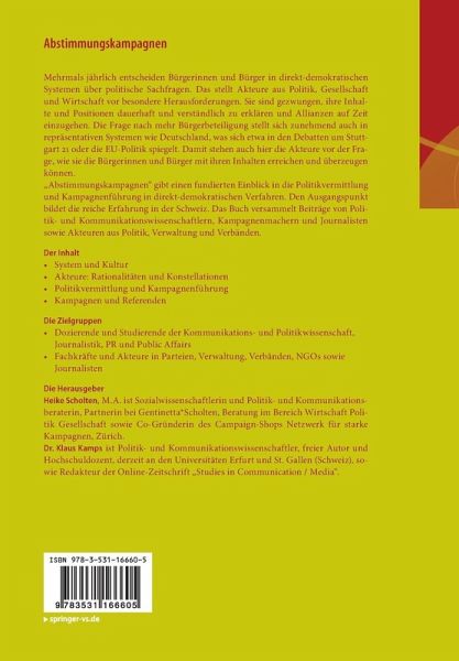 "Abstimmungskampagnen" gibt einen fundierten Einblick in die Politikvermittlung und Kampagnenführung in direkt-demokratischen Verfahren. Den Ausgangspunkt bildet die reiche Erfahrung in der Schweiz. Das Buch versammelt Beiträge von Politik- und Kommunikationswissenschaftlern, Kampagnenmachern und Journalisten sowie Akteuren aus Politik, Verwaltung und Verbänden.
