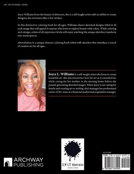 Joyce Williams loves the beauty of abstracts, she is a self taught artist with an ability to create designes she envisions after a few strokes. In this distinctive coloring book for all ages, Williams shares sketched designs titled to fit each image that will appeal to anyone who loves to explore beauty with colors. While coloring each design, artists of all experience levels will enjoy watching the unique sketches transform into masterpieces. Abstrabulous is a unique abstract coloring book titled with sketches that introduce a touch of creative art for all ages.