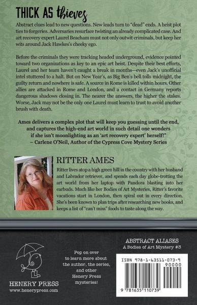 USA TODAY BESTSELLING AUTHOR "Short of hopping on a plane, tearing across Europe with art expert Laurel Beacham is the way to travel. In Abstract Aliases, Ritter Ames delivers a complex plot that will keep you guessing until the end, and captures the high-end art world in such detail one wonders if she isn't moonlighting as an 'art recovery expert' herself!" - Carlene O'Neil, Author of the Cypress Cove Mystery Series "Filled with twists and turns, action, art heists, and plenty of chemistry between the very handsome Jack Hawkes and daring narrator Laurel Beacham…rich descriptions and a discriminating tone of detail…Abstract Aliases continues an excellent collection from Ritter Ames." - Girl with Book Lungs Abstract clues lead to new questions. New leads turn to "dead" ends. A heist plot ties to forgeries. Adversaries resurface twisting an already complicated case. And art recovery expert Laurel Beacham must not only outwit criminals, but keep her wits around Jack Hawkes's cheeky ego. Before the criminals they were tracking headed underground, evidence pointed toward two organizations as key to an epic art heist. Despite their best efforts, Laurel and her team haven't caught a break in months-even Jack's unofficial intel stuttered to a halt. But on New Year's, as Big Ben's bell tolls midnight, the guilty return and nowhere is safe. A source in Rome is killed within hours. Other allies are attacked in Rome and London, and a contact in Germany reports dangerous shadows closing in. The nearer the answers, the higher the stakes. Worse, Jack may not be the only one Laurel must learn to trust to avoid another brush with death. Related subjects include: women sleuths, cozy mysteries, amateur sleuth books, murder mysteries, whodunit mysteries (whodunnit), book club recommendations. Books in the Bodies of Art Mystery Series: COUNTERFEIT CONSPIRACIES (#1) MARKED MASTERS (#2) ABSTRACT ALIASES (#3) Part of the Henery Press Mystery Series Collection, if you like one, you'll probably like them all… Author Bio: Ritter Ames lives atop a high green hill in the country with her husband and Labrador retriever, and spends each day globe-trotting the art world from her laptop with Pandora blasting into her earbuds. Often with the dog snoring at her feet. Much like her Bodies of Art Mysteries, Ritter's favorite vacations start in London, then spiral out in every direction. She's been known to plan trips after researching new books, and keeps a list of "can't miss" foods to taste along the way. Visit her at www.ritterames.com where she blogs about all the crazy things that interest her.