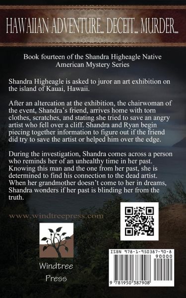 Book 14 in the Shandra Higheagle Mystery series Hawaiian adventure, Deceit, Murder Shandra Higheagle is asked to juror an art exhibition on the island of Kauai, Hawaii. After an altercation at the exhibition, the chairwoman of the event, Shandra's friend, arrives home with torn clothes, scratches, and stating she tried to save an angry artist who fell over a cliff. Shandra and Ryan begin piecing together information to figure out if the friend did try to save the artist or helped him over the edge. During the investigation, Shandra comes across a person who reminds her of an unhealthy time in her past. Knowing this man and the one from her past, she is determined to find his connection to the dead artist. When her grandmother doesn't come to her in dreams, Shandra wonders if her past is blinding her from the truth.