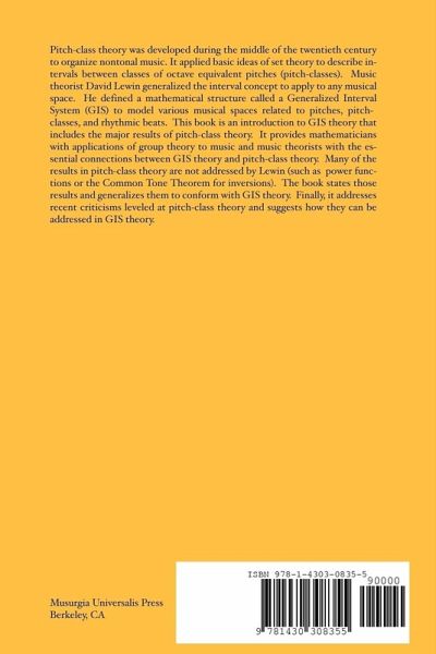 This book is an introduction to GIS (Generalized Interval Systems) theory that includes the major results of pitch-class theory. It provides mathematicians with applications of group theory to music and music theorists with the essential connections betw