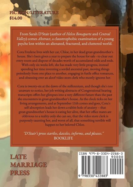 Cora Freelene lives with her cat, Chloe, in her dead great-grandmother's house. She's been given a year to prepare the house for sale - to clear out every room and dispose of decades worth of accumulated odds and ends. With only six weeks left, she has made very little progress, instead spending her time inventing a sordid ancestral past, moving things pointlessly from one place to another, engaging in futile office romances, and obsessing over an aloof video store clerk who mostly ignores her. Cora is twenty-six at the dawn of the millennium, and though she's too unaware to notice, her job writing abstracts of Congressional hearing transcripts offers her glimpses into a very different future than the past she encounters in great-grandmother's house. As the clock ticks on her living arrangements, and as September 11th comes and goes, Cora's self-absorption leads her down a rabbit hole of anxiety -- that great-grandmother's house is eating her alive, that her office mates are oblivious to a reality only she can see, that the video store clerk is purposely taunting her, and worst of all, that something terrible will happen to her beloved Chloe. From Sarah D'Stair (author of Helen Bonaparte and Central Valley) comes Abstract, a claustrophobic examination of a young psyche lost within an alienated, fractured, and cluttered world. Perhaps one's only defense is to reduce the disorder to its most compact linguistic form. Perhaps, however, the lonely world retaliates by abstracting us back.