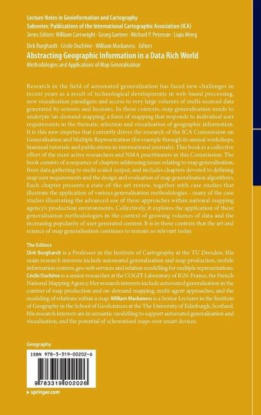 Research in the field of automated generalisation has faced new challenges in recent years as a result of technological developments in web-based processing, new visualisation paradigms and access to very large volumes of multi-source data generated by sensors and humans. In these contexts, map generalisation needs to underpin 'on-demand mapping', a form of mapping that responds to individual user requirements in the thematic selection and visualisation of geographic information. It is this new impetus that drives the research of the ICA Commission on Generalisation and Multiple Representation (for example through its annual workshops, biannual tutorials and publications in international journals). This book has a coherent structure, each chapter focusing on core concepts and tasks in the map generalisation towards on-demand mapping. Each chapter presents a state-of-the-art review, together with case studies that illustrate the application of pertinent generalisation methodologies. Thebook addresses issues from data gathering to multi scaled outputs. Thus there are chapters devoted to defining user requirements in handling specifications, and in the application and evaluation of map generalisation algorithms. It explores the application of generalisation methodologies in the context of growing volumes of data and the increasing popularity of user generated content.