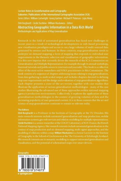 Research in the field of automated generalisation has faced new challenges in recent years as a result of technological developments in web-based processing, new visualisation paradigms and access to very large volumes of multi-source data generated by sensors and humans. In these contexts, map generalisation needs to underpin 'on-demand mapping', a form of mapping that responds to individual user requirements in the thematic selection and visualisation of geographic information. It is this new impetus that drives the research of the ICA Commission on Generalisation and Multiple Representation (for example through its annual workshops, biannual tutorials and publications in international journals). This book has a coherent structure, each chapter focusing on core concepts and tasks in the map generalisation towards on-demand mapping. Each chapter presents a state-of-the-art review, together with case studies that illustrate the application of pertinent generalisation methodologies. Thebook addresses issues from data gathering to multi scaled outputs. Thus there are chapters devoted to defining user requirements in handling specifications, and in the application and evaluation of map generalisation algorithms. It explores the application of generalisation methodologies in the context of growing volumes of data and the increasing popularity of user generated content.