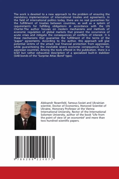 The work is devoted to a new approach to the problem of ensuring the mandatory implementation of international treaties and agreements. In the field of international politics today, there are no real guarantees for the fulfillment of treaties between countries, as well as a system of requirements for fulfilling obligations in accordance with the UN Charter.The author focuses on modern mechanisms and methods of economic regulation of global markets that prevent the occurrence of acute crises and mitigate the consequences of conflicts of interest. It is these mechanisms that guarantee the fulfillment of the terms of the "paper" agreements. According to the author, this approach will give potential victims of the attack real financial protection from aggression, while guaranteeing the inevitable severe economic consequences for the aggressor countries. Among the tools offered in the publication, there is a brief but rather exhaustive description of a specialized built-in stabilizer (SAB bonds of the "Surprise Attac Bond" type).