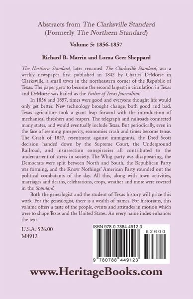 The Northern Standard, later renamed The Clarksville Standard, was a weekly newspaper first published in 1842 by Charles DeMorse in Clarksville, a small town in the northeastern corner of the Republic of Texas. The paper grew to become the second largest in circulation in Texas and DeMorse was hailed as the Father of Texas Journalism. In 1856 and 1857, times were good and everyone thought life would only get better. New technology brought change, both good and bad. Texas agriculture took a giant leap forward with the introduction of mechanical threshers and reapers. The telegraph and railroads connected many states, and would eventually include Texas. But periodically, even in the face of seeming prosperity, economies crash and times become tense. The Crash of 1857, resentment against immigrants, the Dred Scott decision handed down by the Supreme Court, the Underground Railroad, and insurrection conspiracies all contributed to the undercurrent of stress in society. The Whig party was disappearing, the Democrats were split between North and South, the Republican Party was forming, and the Know Nothings' American Party rounded out the political combatants of the day. All this, along with town activities, marriages and deaths, celebrations, crops, weather and more were covered in the Standard. Both the genealogist and the student of Texas history will prize this work. For the genealogist, there is a wealth of names. For historians, this volume offers a taste of the people, events and attitudes in motion which were to shape Texas and the United States. An every name index enhances the text.