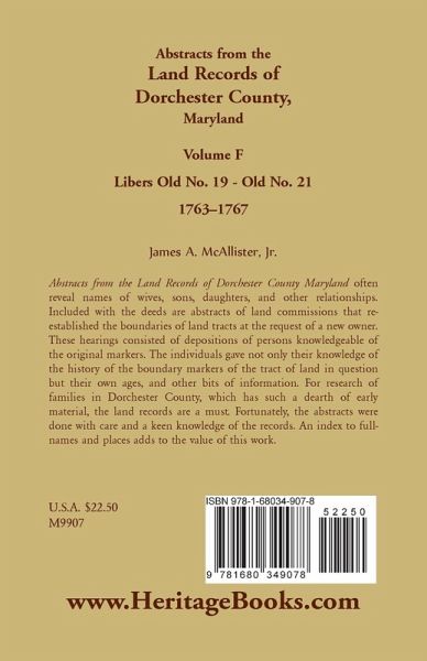 Abstracts from the Land Records of Dorchester County Maryland often reveal names of wives, sons, daughters, and other relationships. Included with the deeds are abstracts of land commissions that re-established the boundaries of land tracts at the request of a new owner. These hearings consisted of depositions of persons knowledgeable of the original markers. The individuals gave not only their knowledge of the history of the boundary markers of the tract of land in question but their own ages, and other bits of information. For research of families in Dorchester County, which has such a dearth of early material, the land records are a must. Fortunately, the abstracts were done with care and a keen knowledge of the records. An index to full-names and places adds to the value of this work.