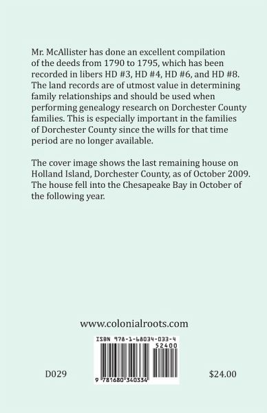 Mr. McAllister has provided abstracts of the deeds of Dorchester County, Maryland, for the years 1790 through 1795 as recorded in Libers HD #3, HD #4, HD #6, and HD #8. These land records are of extreme importance in determining family relationships and doing genealogy research since the wills of Dorchester County are not available for this time period.