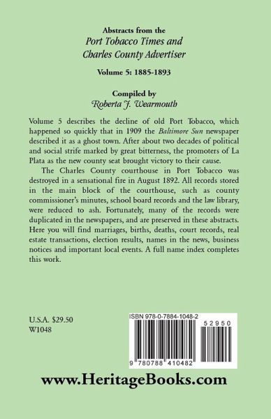 Volume 5 describes the decline of old Port Tobacco, which happened so quickly that in 1909 the Baltimore Sun newspaper described it as a ghost town. After about two decades of political and social strife marked by great bitterness, the promoters of La Plata as the new county seat brought victory to their cause. The Charles County courthouse in Port Tobacco was destroyed in a sensational fire in August 1892. All records stored in the main block of the courthouse, such as county commissioner's minutes, school board records and the law library, were reduced to ash. Fortunately, many of the records were duplicated in the newspapers, and are preserved in these abstracts. Here you will find marriages, births, deaths, court records, real estate transactions, election results, names in the news, business notices and important local events. A full name index completes this work.