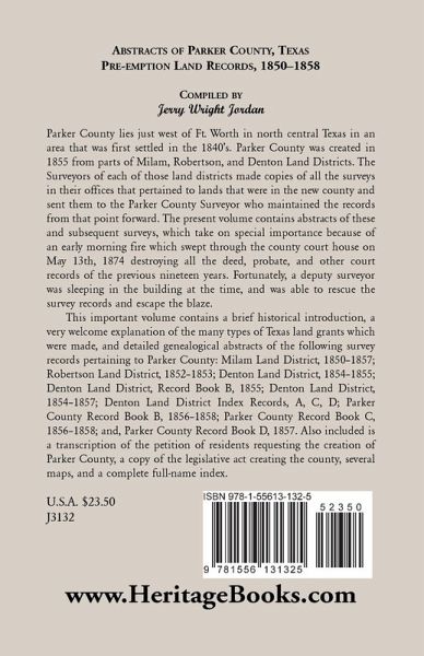 Parker County lies just west of Ft. Worth in north central Texas in an area that was first settled in the 1840's. Parker County was created in 1855 from parts of Milam, Robertson, and Denton Land Districts. The Surveyors of each of those land districts made copies of all the surveys in their offices that pertained to lands that were in the new county and sent them to the Parker County Surveyor who maintained the records from that point forward. The present volume contains abstracts of these and subsequent surveys, which take on special importance because of an early morning fire which swept through the county court house on May 13th, 1874 destroying all the deed, probate, and other court records of the previous nineteen years. Fortunately, a deputy surveyor was sleeping in the building at the time, and was able to rescue the survey records and escape the blaze. This important volume contains a brief historical introduction, a very welcome explanation of the many types of Texas land grants which were made, and detailed genealogical abstracts of the following survey records pertaining to Parker County: Milam Land District, 1850-1857; Robertson Land District, 1852-1853; Denton Land District, 1854-1855; Denton Land District, Record Book B, 1855; Denton Land District, 1854-1857; Denton Land District Index Records, A, C, D; Parker County Record Book B, 1856-1858; Parker County Record Book C, 1856-1858; and, Parker County Record Book D, 1857. Also included is a transcription of the petition of residents requesting the creation of Parker County, a copy of the legislative act creating the county, several maps, and a complete full-name index.