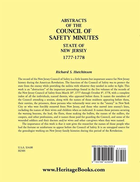 The record of the New Jersey Council of Safety is a little known but important source for New Jersey history during the American Revolution. The function of the Council of Safety was to protect the state from the enemy while providing the militia with whatever they needed in order to fight. This work is an "abstraction" of the important proceedings found in the five volumes of the records of the New Jersey Council of Safety from March 18th, 1777 through October 8th, 1778, with a complete index of all the individuals, named therein, who appeared before them. It names the members of the Council attending a session, along with the names of those residents appearing before them, their sureties, the prisoners, those persons who voluntarily went over to the "enemy" in New York City or who were forcibly removed from New Jersey, and those who moved into enemy's lines, including the names of their wives and children when so indicated. It names those persons securing the warning beacons, the lead, the flints, those making the bullets, the names of the millers, the coopers, and other professions, and it names those paid for guarding the Council, and some of the wounded soldiers and their doctors and/or wives and other care-givers when they were named. The importance of this work is that it now gives the researcher the names of those people who had the fortune or misfortune to appear before the Council of Safety. It is an untapped source for the genealogist working on New Jersey family histories during this period of the Revolution.