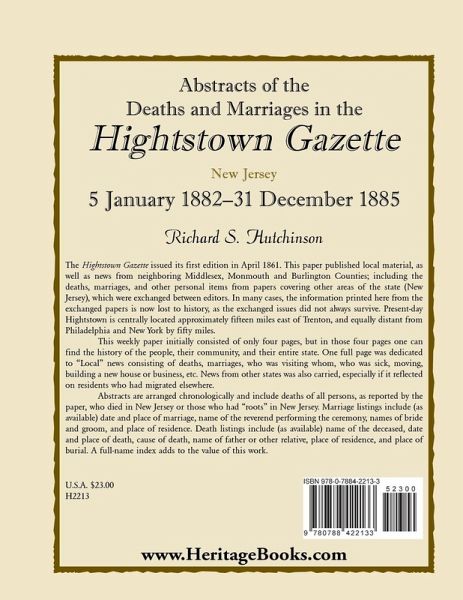 The Hightstown Gazette issued its first edition in April 1861. This paper published local material, as well as news from neighboring Middlesex, Monmouth and Burlington counties; including the deaths, marriages, and other personal items from papers covering other areas of the state (NJ), which were exchanged between editors. In many cases, the information printed here from the exchanged papers is now lost to history, as the exchanged issues did not always survive. Present-day Hightstown is centrally located approximately fifteen miles east of Trenton, and equally distant from Philadelphia and New York by 50 miles. This weekly paper initially consisted of only 4 pages, but in those 4 pages one can find the history of the people, their community, and their entire state. One full page was dedicated to "Local" news consisting of deaths, marriages, who was visiting whom, who was sick, moving, building a new house or business, etc. News from other states was also carried, especially if it reflected on residents who had migrated elsewhere. Abstracts are arranged chronologically and include deaths of all persons, as reported by the paper, who died in New Jersey or those who had "roots" in New Jersey. Marriage listings include (as available) date and place of marriage, name of the reverend performing the ceremony, names of bride and groom, and place of residence. Death listings include (as available) name of the deceased, date and place of death, cause of death, name of father or other relative, place of residence, and place of burial. A fullname index adds to the value of this work.