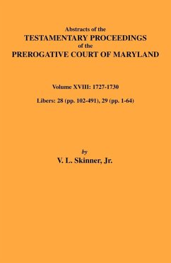 This is the eighteenth volume in the series "Abstracts of the Testamentary Proceedings of the Prerogative Court of Maryland." The series is arranged, volume by volume, chronologically by court session. Volume XVIII consists of abstracts of the records for the period 1727-30, as found in the remainder of Liber 28 and the first 64 pages of Liber 29. In all, the latest book in this remarkable series refers to an additional 8,500 inhabitants of the Province of Maryland in the years just prior to 1730.