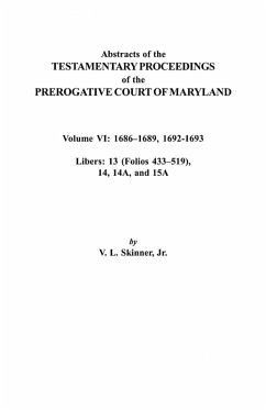 Genealogist V. L. Skinner, Jr., resumes his transcriptions of 17th-century Maryland probate records with the sixth volume of his series, "Abstracts of the Testamentary Proceedings of the Prerogative Court of Maryland." Volume VI covers the years 1686-1689 and 1692-1693 and is based on Libers 13 (Folios 432-519), 14, 14A and 15A. Mr. Skinner has combed through administration, bond, will, inventory, administration account, and final balance entries to produce this collection. The abstracts are arranged chronologically by court session. For the most part, the transcriptions state the names of the principals (testators, heirs, witnesses, administrators, and so forth) as well as details of bequests, names of slaves, appraisers, and more. Volume VI refers to about 8,000 17th-century Marylanders whose existence and activities would otherwise remain buried in some rich but very off-the-beaten-track records.