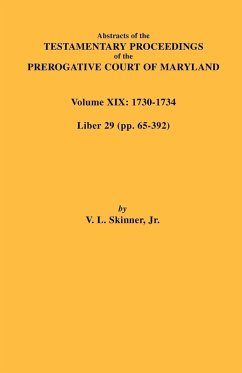 Compiler Vernon Skinner has completed the 19th volume of "Abstracts of the Testamentary Proceedings of the Prerogative Court of Maryland," a series of books based upon this important source for Maryland genealogists. In compiling the series, Mr. Skinner has worked primarily from microfilm copies of the Prerogative Court records; however, he has also traveled to the Maryland State Archives to work directly with the original manuscripts in order to resolve problems associated with eighteenth-century handwriting or limitations of the microfilming process. The series is arranged, volume by volume, chronologically by court session. Volume XIX consists of abstracts for the period 1730-34, as found in the remainder of Liber 29 of these records. In all, the latest book in this remarkable series refers to an additional 6,500 inhabitants of the Province of Maryland in the years just prior to 1730.