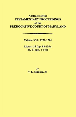 The Prerogative Court was the focal point for probate in colonial Maryland. All matters of probate went directly to the Prerogative Court, which was located in Annapolis, Maryland's colonial capital. The Prerogative Court was also the colony's court for equity cases--resolution of disputes over the settlement and distribution of an estate. Volume XVI consists of abstracts of the records for the period 1721-24, as found in the remainder of Liber 25, Liber 26, and the first 140 pages of Liber 27. The abstracts are arranged chronologically by court session. For the most part, the transcriptions state the names of the principals (testators, heirs, witnesses, administrators, and so forth) as well as details of bequests, names of slaves, appraisers, and more.