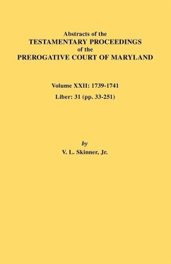 The Prerogative Court was the focal point for probate in colonial Maryland. Compiler Vernon Skinner has produced the twenty-second volume in this series, based upon this important source for Maryland genealogists. The series is arranged, volume by volume, chronologically by court session. Volume XXII consists of abstracts for the period 1739-41, as found in Liber 31 of the records. In all, the latest book in this remarkable series refers to an additional 7,000 colonial inhabitants of the Province of Maryland. For the most part, the transcriptions state the names of the principals (testators, heirs, guardians, witnesses, administrators, and so forth) as well as details of bequests, names of slaves, appraisers, and more.