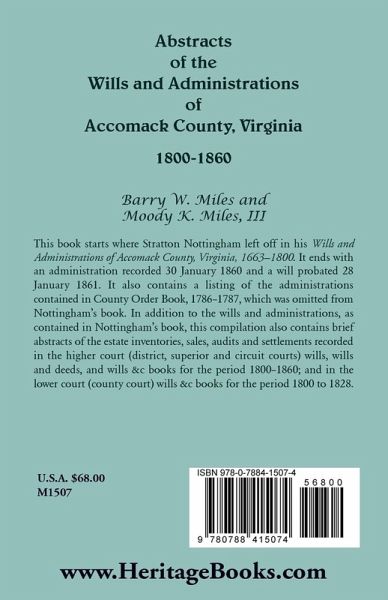 This book starts where Stratton Nottingham left off in his Wills and Administrations of Accomack County, Virginia, 1663-1800. It ends with an administration recorded 30 January 1860 and a will probated 28 January 1861. It also contains a listing of the administrations contained in County Order Book, 1786-1787, which was omitted from Nottingham's book. In addition to the wills and administrations, as contained in Nottingham's book, this compilation also contains brief abstracts of the estate inventories, sales, audits and settlements recorded in the higher court (district, superior and circuit courts) wills, wills and deeds, and wills &c books for the period 1800-1860; and in the lower court (county court) wills &c books for the period 1800 to 1828.