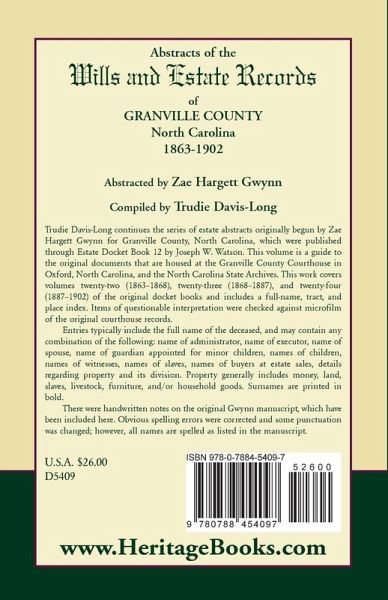 Trudie Davis-Long continues the series of estate abstracts originally begun by Zae Hargett Gwynn for Granville County, North Carolina, which were published through Estate Docket Book 12 by Joseph W. Watson. This volume is a guide to the original documents that are housed at the Granville County Courthouse in Oxford, North Carolina, and the North Carolina State Archives. This work covers volumes twenty-two (1863-1868), twenty-three (1868-1887), and twenty-four (1887-1902) of the original docket books and includes a full-name, tract, and place index. Items of questionable interpretation were checked against microfilm of the original courthouse records. Entries typically include the full name of the deceased, and may contain any combination of the following: name of administrator, name of executor, name of spouse, name of guardian appointed for minor children, names of children, names of witnesses, names of slaves, names of buyers at estate sales, details regarding property and its division. Property generally includes money, land, slaves, livestock, furniture, and/or household goods. Surnames are printed in bold. There were handwritten notes on the original Gwynn manuscript, which have been included here. Obvious spelling errors were corrected and some punctuation was changed; however, all names are spelled as listed in the manuscript.