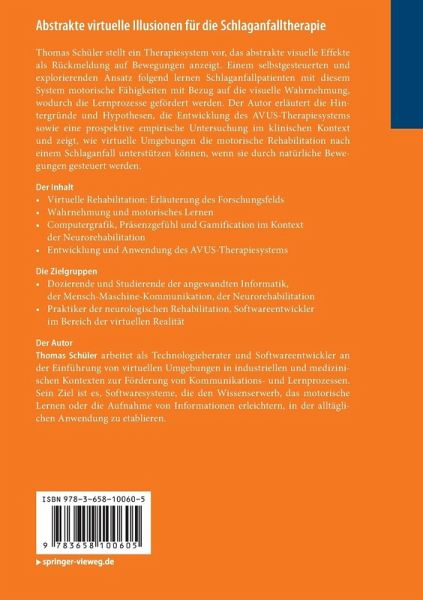 Thomas Schüler stellt ein Therapiesystem vor, das abstrakte visuelle Effekte als Rückmeldung auf Bewegungen anzeigt. Einem selbstgesteuerten und explorierenden Ansatz folgend lernen Schlaganfallpatienten mit diesem System motorische Fähigkeiten mit Bezug auf die visuelle Wahrnehmung, wodurch die Lernprozesse gefördert werden. Der Autor erläutert die Hintergründe und Hypothesen, die Entwicklung des AVUS-Therapiesystems sowie eine prospektive empirische Untersuchung im klinischen Kontext und zeigt, wie virtuelle Umgebungen die motorische Rehabilitation nach einem Schlaganfall unterstützen können, wenn sie durch natürliche Bewegungen gesteuert werden.