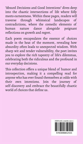 "Absurd Decisions and Good Intentions" dives deep into the chaotic intersections of life where folly meets earnestness. Within these pages, readers will traverse through whimsical landscapes of contradictions, where the comedic elements of human nature dance alongside poignant reflections on growth and regret. Each poem encapsulates the essence of choices made in the heat of the moment, revealing how absurdity often leads to unexpected wisdom. With sharp wit and tender vulnerability, the poet invites you to explore the rich tapestry of life's dilemmas, celebrating both the ridiculous and the profound in our everyday decisions. This collection offers a unique blend of humor and introspection, making it a compelling read for anyone who has ever found themselves at odds with their own intentions. Join the journey of self-discovery and embrace the beautifully chaotic world of choices that define us.