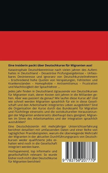 Die Praxis von Deutschkursen für Migranten:Katastrophale Deutschkenntnisse nach vielen Jahren des Aufenthaltes in Deutschland - Unfassbares Desinteresse und Ignoranz von Deutschkursteilnehmern - Desaströse Prüfungsergebnisse - Hasserfüllter Antisemitismus - Tief verwurzelte Homophobie - Erschreckend hohe Quoten von Verspätungen, Fehlzeiten und Krankenständen - Frustration und Machtlosigkeit von Sprachlehrern...Ein detailliertes Sachbuch über die tägliche Durchführungspraxis von Deutschkursen für Migranten von einer Sprachlehrerin.