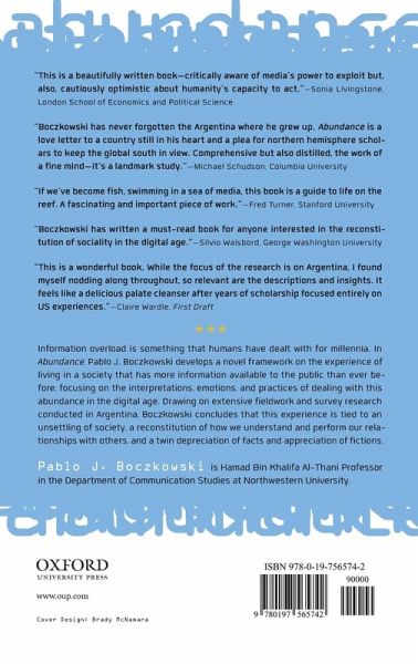 Abundance examines the experience of living in a society that has more information available to the public than ever before. It focuses on the interpretations, emotions, and practices of dealing with this abundance in everyday life. Drawing on extensive fieldwork and survey research conducted in Argentina, the book concludes that the experience of information abundance is tied to an unsettling of society, a reconstitution of how we understand and perform our relationships with others, and a twin depreciation of facts and appreciation of fictions.