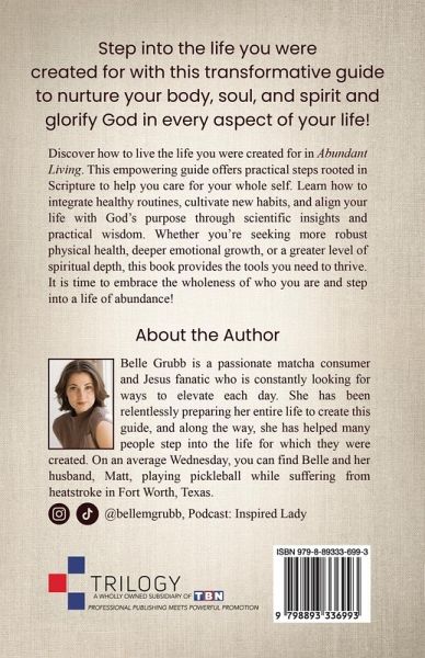 Step into the life you were created for with this transformative guide to nurture your body, soul, and spirit and glorify God in every aspect of your life! Discover how to live the life you were created for in Abundant Living. This empowering guide offers practical steps rooted in Scripture to help you care for your whole self. Learn how to integrate healthy routines, cultivate new habits, and align your life with God's purpose through scientific insights and practical wisdom. Whether you're seeing more robust physical health, deeper emotional growth, or greater level of spiritual depth, this book provides the tools you need to thrive. It is time to embrace the wholeness of who you are and step into a life of abundance!