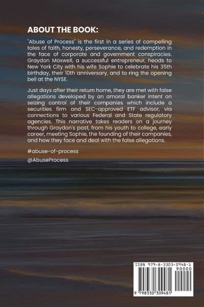 "Abuse of Process" is the first in a series of compelling tales of faith, honesty, perseverance, and redemption in the face of corporate and government conspiracies. Graydon Maxwell, a successful entrepreneur, heads to New York City with his wife Sophie to celebrate his 35th birthday, their 10th anniversary, and to ring the opening bell at the NYSE. Just days after their return home, they are met with false allegations developed by an amoral banker intent on seizing control of their companies which include a securities firm and SEC-approved ETF advisor, via connections to various Federal and State regulatory agencies. This narrative takes readers on a journey through Graydon's past, from his youth to college, early career, meeting Sophie, the founding of their companies, and how they face and deal with the false allegations.