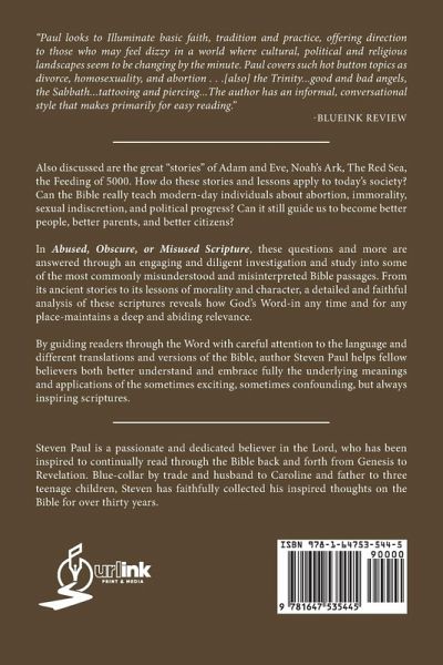 "Paul looks to Illuminate basic faith, tradition and practice, offering direction to those who may feel dizzy in a world where cultural, political and religious landscapes seem to be changing by the minute. Paul covers such hot button topics as divorce, homosexuality, and abortion . . .[also] the Trinity...good and bad angels, the Sabbath...tattooing and piercing...The author has an informal, conversational style that makes primarily for easy reading." -BLUEINK REVIEW Also discussed are the great "stories" of Adam and Eve, Noah's Ark, The Red Sea, the Feeding of 5000. How do these stories and lessons apply to today's society? Can the Bible really teach modern-day individuals about abortion, immorality, sexual indiscretion, and political progress? Can it still guide us to become better people, better parents, and better citizens? In Abused, Obscure, or Misused Scripture, these questions and more are answered through an engaging and diligent investigation and study into some of the most commonly misunderstood and misinterpreted Bible passages. From its ancient stories to its lessons of morality and character, a detailed and faithful analysis of these scriptures reveals how God's Word in any time and for any place-maintains a deep and abiding relevance. By guiding readers through the Word with careful attention to the language and different translations and versions of the Bible, author Steven Paul helps fellow believers both better understand and embrace fully the underlying meanings and applications of the sometimes exciting, sometimes confounding, but always inspiring scriptures.