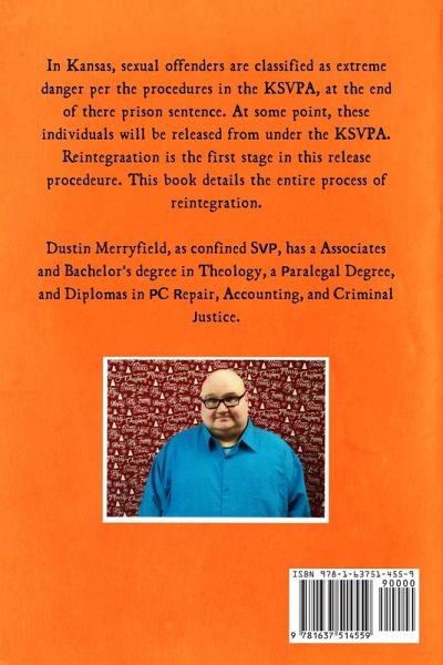 In Kansas, sexual offenders are classified as an extreme danger, per the procedures in the KSVPA. This occurs at the end of there prison sentence. At some point, these individuals will be released from under the KSVPA. Reintegration is the first stage in this release procedure. This book details the entire process of reintegration. Dustin Merryfield, as confined SVP, has a Associates and Bachelor's degree in Theology, a Paralegal Degree, and Diplomas in PC Repair, Accounting, and Criminal Justice.