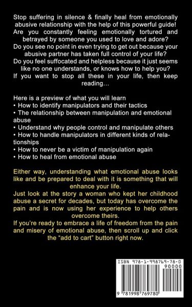 Stop suffering in silence & finally heal from emotionally abusive relationship with the help of this powerful guide! Are you constantly feeling emotionally tortured and betrayed by someone you used to love and adore? Do you see no point in even trying to get out because your abusive partner has taken full control of your life? Do you feel suffocated and helpless because it just seems like no one understands, or knows how to help you? If you want to stop all these in your life, then keep reading... Here is a preview of what you will learnHow to identify manipulators and their tactics The relationship between manipulation and emotional abuse Understand why people control and manipulate others How to handle manipulators in different kinds of relationships How to never be a victim of manipulation again How to heal from emotional abuse Either way, understanding what emotional abuse looks like and be prepared to deal with it is something that will enhance your life. Just look at the story a woman who kept her childhood abuse a secret for decades, but today has overcome the pain and is now using her experience to help others overcome theirs. If you're ready to embrace a life of freedom from the pain and misery of emotional abuse, then scroll up and click the "add to cart" button right now.