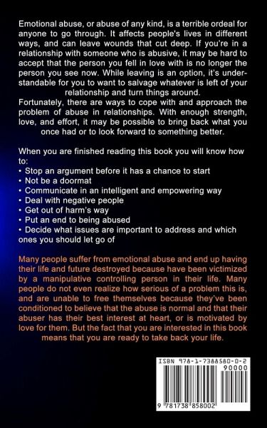 Emotional abuse, or abuse of any kind, is a terrible ordeal for anyone to go through. It affects people's lives in different ways, and can leave wounds that cut deep. If you're in a relationship with someone who is abusive, it may be hard to accept that the person you fell in love with is no longer the person you see now. While leaving is an option, it's understandable for you to want to salvage whatever is left of your relationship and turn things around. Fortunately, there are ways to cope with and approach the problem of abuse in relationships. With enough strength, love, and effort, it may be possible to bring back what you once had or to look forward to something better. When you are finished reading this book you will know how to:Stop an argument before it has a chance to start Not be a doormat Communicate in an intelligent and empowering way Deal with negative people Get out of harm's way Put an end to being abused Decide what issues are important to address and which ones you should let go of Many people suffer from emotional abuse and end up having their life and future destroyed because have been victimized by a manipulative controlling person in their life. Many people do not even realize how serious of a problem this is, and are unable to free themselves because they've been conditioned to believe that the abuse is normal and that their abuser has their best interest at heart, or is motivated by love for them. But the fact that you are interested in this book means that you are ready to take back your life.