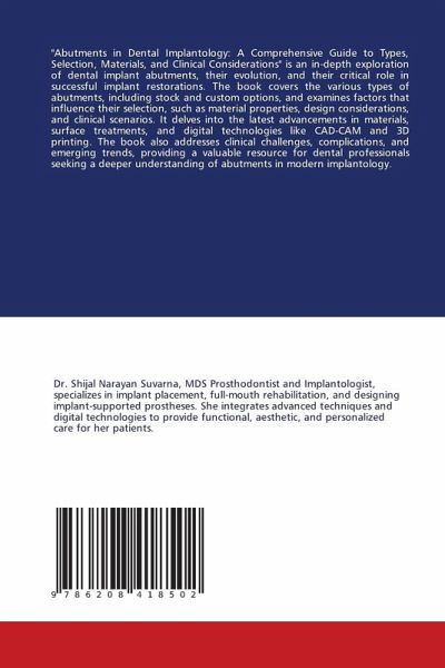 "Abutments in Dental Implantology: A Comprehensive Guide to Types, Selection, Materials, and Clinical Considerations" is an in-depth exploration of dental implant abutments, their evolution, and their critical role in successful implant restorations. The book covers the various types of abutments, including stock and custom options, and examines factors that influence their selection, such as material properties, design considerations, and clinical scenarios. It delves into the latest advancements in materials, surface treatments, and digital technologies like CAD-CAM and 3D printing. The book also addresses clinical challenges, complications, and emerging trends, providing a valuable resource for dental professionals seeking a deeper understanding of abutments in modern implantology.