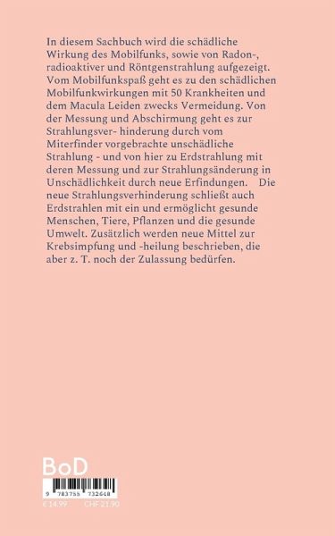 In diesem Sachbuch wird die schädliche Wirkung des Mobilfunks, sowie von Radon-, radioaktiver und Röntgenstrahlung aufgezeigt. Vom Mobilfunkspaß geht es zu den schädlichen Mobilfunkwirkungen mit 50 Krankheiten und dem Macula Leiden zwecks Vermeidung. Von der Messung und Abschirmung geht es zur Strahlungsverhinderung durch vom Miterfinder vorgebrachte unschädliche Strahlung - und von hier zu Erdstrahlung mit deren Messung und zur Strahlungsänderung in Unschädlichkeit durch neue Erfindungen. Die neue Strahlungsverhinderung schließt auch Erdstrahlen mit ein und ermöglicht gesunde Menschen, Tiere, Pflanzen und die gesunde Umwelt. Zusätzlich werden neue Mittel zur Krebsimpfung und -heilung beschrieben, die aber z. T. noch der Zulassung bedürfen.