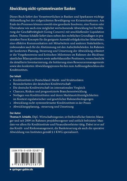 Dieses Buch liefert den Verantwortlichen in Banken und Sparkassen wichtige Hilfestellung bei der zielgerichteten Bewältigung von Krisensituationen. Am Ende des Prozesses können sowohl eine geordnete Insolvenz, eine Fusion oder Übernahme wie auch eine möglichst wertschonende Abwicklung bei Fortführung der Geschäftstätigkeit (Going Concern) mit anschließender Liquidation stehen. Thomas Schädle liefert dazu neben den rechtlichen Grundlagen in praxisnaher Form Konzepte für die geeignete Auswahl erfolgskritischer Mitarbeiter, eine effektive Kommunikation mit Mitarbeitern und anderen Stakeholdern, insbesondere auch für die Abstimmung mit den Aufsichtsbehörden. Im Rahmen der konkreten Planung, Steuerung und Umsetzung der Abwicklung erläutert er die Vorgehensweise und kritischen Milestones im Rahmen des Rückbaus sämtlicher Bilanzpositionen sowie außerbilanzieller Positionen, veranschaulicht die detaillierte Inventarisierung, die Initiierung eines Ressourcenmanagements sowie den konkreten Abwicklungsprozess bis hin zum Auflösungsbeschluss des Kreditinstituts.