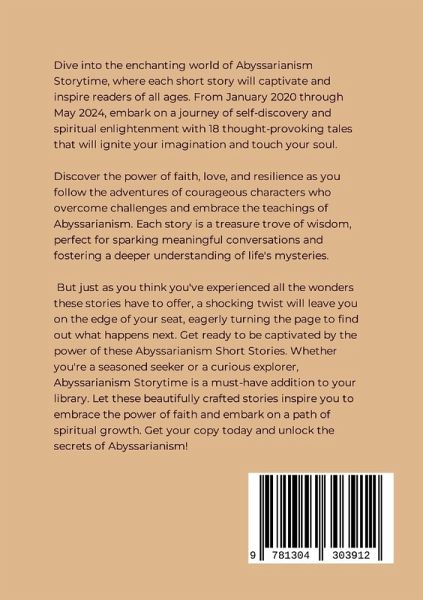 A collection of exhilarating, entertaining, religious-spiritual short abyssarianism stories that will uplift, enlighten, and make you smile with wonder about life on earth. --------------------------- Dive into the enchanting world of Abyssarianism Storytime, where each short story will captivate and inspire readers of all ages. From January 2020 through May 2024, embark on a journey of self-discovery and spiritual enlightenment with 21 thought-provoking tales that will ignite your imagination and touch your soul. Discover the power of faith, love, and resilience as you follow the adventures of courageous characters who overcome challenges and embrace the teachings of Abyssarianism. Each story is a treasure trove of wisdom, perfect for sparking meaningful conversations and fostering a deeper understanding of life's mysteries. But just as you think you've experienced all the wonders these stories have to offer, a shocking twist will leave you on the edge of your seat, eagerly turning the page to find out what happens next. Get ready to be captivated by the power of these Abyssarianism Short Stories. Whether you're a seasoned seeker or a curious explorer, Abyssarianism Storytime is a must-have addition to your library. Let these beautifully crafted stories inspire you to embrace the power of faith and embark on a path of spiritual growth. Get your copy today and unlock the secrets of Abyssarianism!