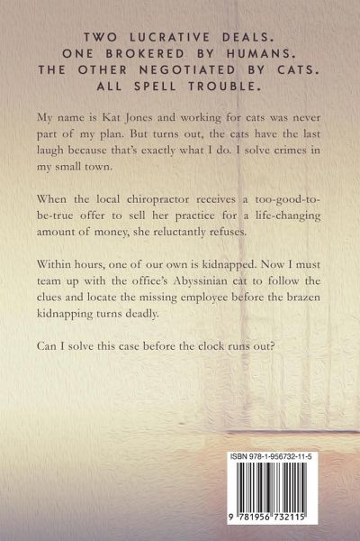 Two lucrative deals. One brokered by humans. The other negotiated by cats. All spell trouble. My name is Kat Jones and working for cats was never part of my plan. But turns out, the cats have the last laugh because that's exactly what I do. I solve crimes in my small town. When the local chiropractor receives a too-good-to-be-true offer to sell her practice for a life-changing amount of money, she reluctantly refuses. Within hours, one of our own is kidnapped. Now I must team up with the office's Abyssinian cat to follow the clues and locate the missing employee before the brazen kidnapping turns deadly. Can I solve this case before the clock runs out?
