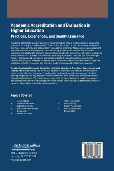 Academic accreditation and evaluation in higher education ensures institutions meet established standards of quality and effectiveness. These practices serve to uphold educational excellence and foster transparency and accountability in academic programs. Through rigorous assessment methods, institutions evaluate their curricula, faculty qualifications, and student outcomes, improving and adapting to changing educational demands. The experiences of various institutions with accreditation processes can reveal valuable insights into best practices and the challenges faced in achieving and maintaining accreditation status. By examining these experiences, researchers may gain a deeper understanding of how quality assurance mechanisms shape the landscape of higher education and influence student success and institutional reputation. Academic Accreditation and Evaluation in Higher Education: Practices, Experiences, and Quality Assurance delves into the crucial aspects of academic accreditation and evaluation in the context of higher education. It explores the best practices and experiences in the field, offering insights into quality assurance mechanisms that drive continuous improvement within educational institutions. This book covers topics such as higher education, quality assurance, and accreditation, and is a useful resource for education professionals, academicians, business owners, policymakers, scientists, and researchers.