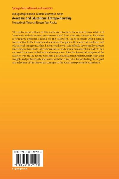 The editors and authors of this textbook introduce the relatively new subject of "academic and educational entrepreneurship" from a holistic viewpoint. Following a structured approach suitable for the classroom, the book opens with a concise introduction to the theories and schools of thoughts in the context of academic and educational entrepreneurship. It then reveals seven scientifically developed key aspects (including sustainability, internationalization, and cultural components) in order to be a successful academic and educational entrepreneur. After the theoretical background, the authors, who are the doyens of academic and educational entrepreneurship, share their insights and professional experiences with the readers by demonstrating the impact and relevance of the theoretical concepts to the actual entrepreneurial experience.