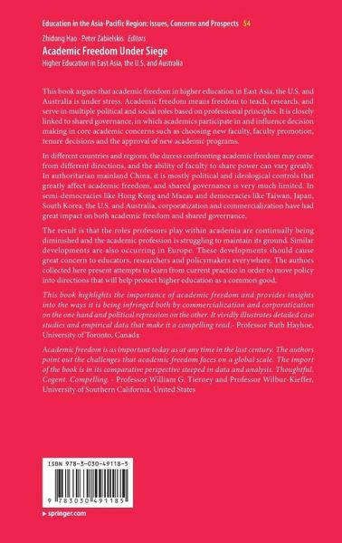 This book argues that academic freedom in higher education in East Asia, the U.S. and Australia is under stress. Academic freedom means freedom to teach, research, and serve in multiple political and social roles based on professional principles. It is closely linked to shared governance, in which academics participate in and influence decision making in core academic concerns such as choosing new faculty, faculty promotion, tenure decisions and the approval of new academic programs.